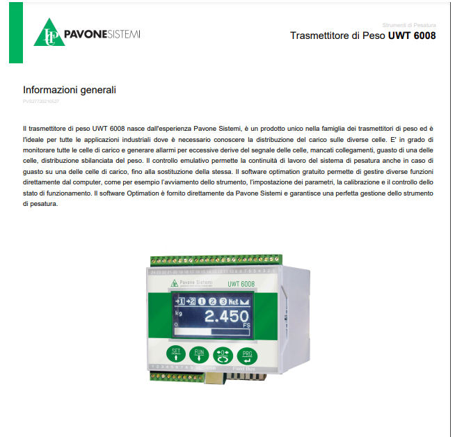 意大利pavone sistemi UWT 6008重量變送器是Pavone Sistemi重量變送器系列中的獨(dú)特產(chǎn)品,意大利Pavone Sistemi稱重變送器適合需要了解不同單元上的負(fù)載分布的所有工業(yè)應(yīng)用。它能夠監(jiān)控所有稱重傳感器與意大利帕瓦內(nèi)壓力傳感器,并在傳感器信號(hào)漂移過大、無連接、其中一個(gè)傳感器故障、重量分布不平衡時(shí)發(fā)出警報(bào)。即使在其中一個(gè)稱重傳感器出現(xiàn)故障的情況下,仿真控制也允許稱重系統(tǒng)的工作連續(xù)性,直到它被更換。免費(fèi)的優(yōu)化軟件可讓您直接從計(jì)算機(jī)管理各種功能,如啟動(dòng)儀器、設(shè)置參數(shù)、操作狀態(tài)的校準(zhǔn)和控制。Optimation 軟件由 Pavone Sistemi 直接提供,保證稱量儀器的完美管理。xBS廣州南創(chuàng)電子科技有限公司