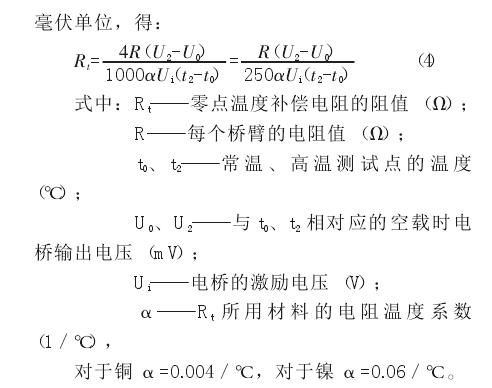 在實(shí)際應(yīng)用中,利用上述計(jì)算公式得到的零點(diǎn)溫度補(bǔ)償電阻值,對(duì)于準(zhǔn)確度等級(jí)不高的稱重傳感器基本能滿足補(bǔ)償要求。對(duì)于高準(zhǔn)確度稱重傳感器并不一定十分合適,需要經(jīng)過(guò)反復(fù)升降溫測(cè)試調(diào)整,才能獲得理想的零點(diǎn)溫度補(bǔ)償結(jié)果。