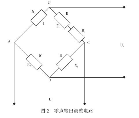 稱重傳感器零點(diǎn)輸出調(diào)整的方法是在無(wú)外載荷作用時(shí),測(cè)量出零點(diǎn)輸出值,根據(jù)零點(diǎn)輸出值的極性和大小,來(lái)判斷零點(diǎn)輸出調(diào)整電阻 Rz應(yīng)串入哪個(gè)橋臂,串入多少電阻才能使電橋處于平衡狀態(tài)。零點(diǎn)輸出調(diào)整電路如圖 2 所示。