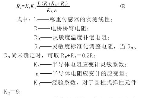 由于彈性元件機(jī)械加工、熱處理和粘貼電阻應(yīng)變計(jì)等因素影響,稱重傳感器的固有非線性誤差分散較大,不能通過(guò) 3 只 ~5 只稱重傳感器進(jìn)行線性補(bǔ)償試驗(yàn),求得線性補(bǔ)償電阻 RL的平均值用于批量生產(chǎn)的線性補(bǔ)償中,必須逐個(gè)稱重傳感器進(jìn)行線性補(bǔ)償。一般線性補(bǔ)償方法為通過(guò)經(jīng)驗(yàn)公式計(jì)算出線性補(bǔ)償電阻值,將其增大 10%~15%就是線性補(bǔ)償半導(dǎo)體應(yīng)變計(jì)的過(guò)補(bǔ)償電阻值。進(jìn)行線性補(bǔ)償時(shí),只需在線性過(guò)補(bǔ)償電阻上并聯(lián)一個(gè)金屬膜線性補(bǔ)償精調(diào)電阻,即可精確調(diào)整稱重傳感器的線性補(bǔ)償特性,達(dá)到線性補(bǔ)償?shù)哪康?。補(bǔ)償特性與許多因素有關(guān),半導(dǎo)體電阻應(yīng)變計(jì)線性補(bǔ)償電阻 RL計(jì)算公式如下: