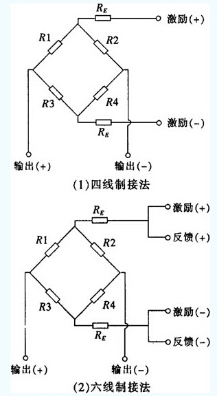 稱重傳感器有四線制接法和六線制接法兩種。稱重傳感器采用四線制接法對二次儀表無特殊要求,便于使用,但電纜線較長時,極易遭受環(huán)境溫度波動等因素的干擾;六線制接法的稱重傳感器要求與之配套使用的二次儀表具備反饋輸入接口,使用范圍具有極限性,但不易遭受環(huán)境溫度波動等因素的干擾,在長距離測量及精密測量時具有一定的優(yōu)勢。QhW廣州南創(chuàng)電子科技有限公司