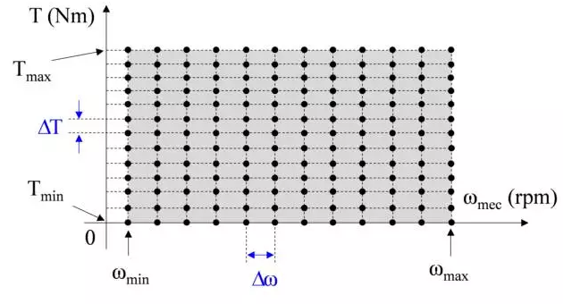 速度范圍 (ωmax-ωmin) 被分成多個(gè)等間距 Δω,合理的數(shù)量為 10 到 20。每個(gè)速度,扭矩變化也同樣按合理的點(diǎn)10到20,分成步進(jìn) ΔT 。結(jié)果就獲得了 扭矩-轉(zhuǎn)速 網(wǎng)格圖,包含 N = n x m 個(gè)點(diǎn)。Wmd廣州南創(chuàng)電子科技有限公司