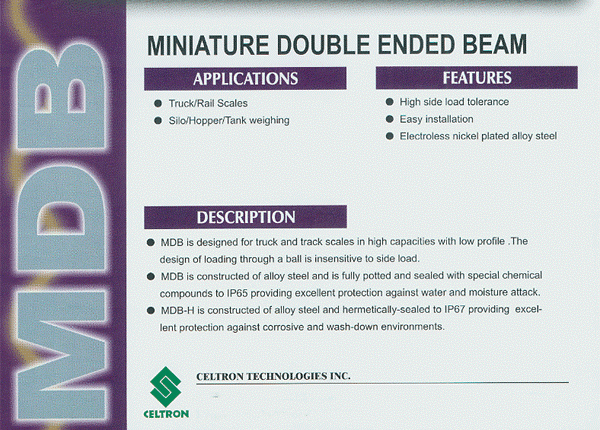 Celtron MDB雙剪切梁式稱重傳感器專為卡車和鐵路的低配置高容量規(guī)模設(shè)計(jì)。在裝載過程中不易受負(fù)載影響。Ols廣州南創(chuàng)電子科技有限公司