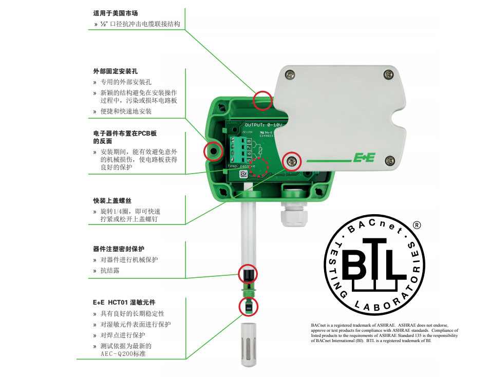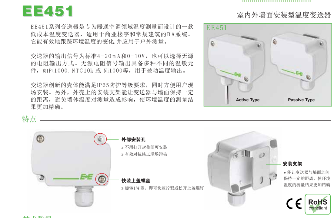 奧地利E+E全系列溫濕度傳感器,ee451系列溫濕度變送器是由奧地利益加義公司專為HVAC系統(tǒng)設(shè)計(jì)開(kāi)發(fā)的全新系列產(chǎn)品。ee451系列變送器具有高精度、低成本的特性,是測(cè)量空氣相對(duì)濕度和溫度的理想儀表,能為用戶提供可靠的溫濕度測(cè)量解決方案。優(yōu)秀的品質(zhì)及全新設(shè)計(jì)的產(chǎn)品外殼,最大程度地降低了安裝成本,減少了現(xiàn)場(chǎng)的工作量,提升了產(chǎn)品抗污染、抗凝結(jié)的性能,從而保證其在工作過(guò)程中將誤差降低到最小程度。ee451系列產(chǎn)品采用了最新的E+E生產(chǎn)的HCT01敏感元件,具備更好的長(zhǎng)期 ee451 穩(wěn)定性和抗污能力。結(jié)合了多年的校準(zhǔn)經(jīng)驗(yàn),ee451的測(cè)量精度可以達(dá)到±2.5%RH,具有電流(mA)、電壓(V)和數(shù)字通訊三種信號(hào)輸出方式?,F(xiàn)場(chǎng)安裝分為墻面安裝和風(fēng)管安裝兩種方式。
