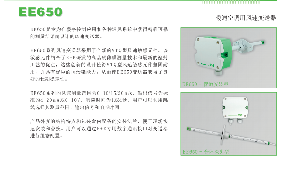 奧地利E+E ee650風(fēng)速傳感器更多產(chǎn)品詳細資料請點擊:E+E風(fēng)速傳感器,進入頁面可查找奧地利E+E風(fēng)速探頭顯示器儀表型號技術(shù)參數(shù)選型資料,以及E+E ee650風(fēng)速變送器具體安裝技術(shù)指導(dǎo)信息。t1o廣州南創(chuàng)電子科技有限公司