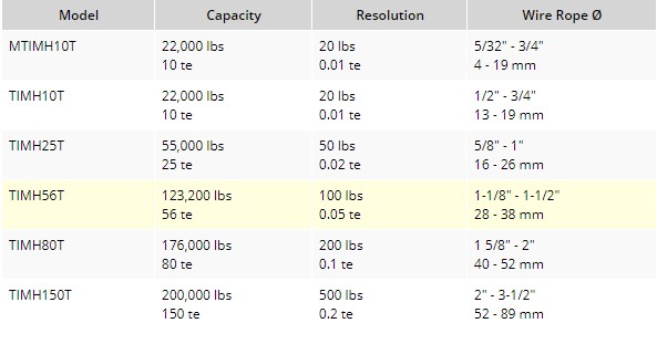 容量范圍從10t到150t,鋼絲繩直徑最大為52mm / 2”