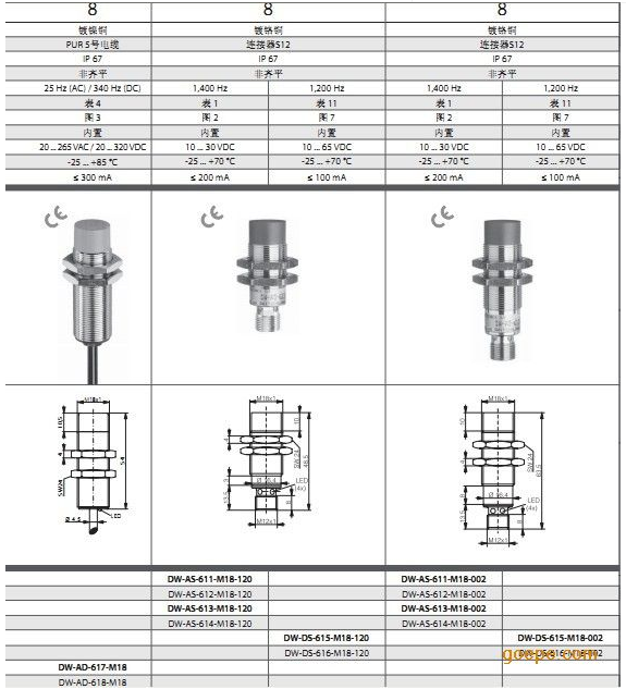 DW-AS-621-M8-001瑞士科瑞接近開(kāi)關(guān)包括Φ6.5mm到M30尺寸的所有常用的傳感器。根據(jù)IEC60947-5-2/EN60947-5-2以及VDE0660中的208節(jié),所有傳感器分別有3線(xiàn)直流,PNP和NPN,都接有電纜或連接器。M12,M18以及M30都有2線(xiàn)型號(hào)(10-30VDC或20-265VAC/20-320VDC)。