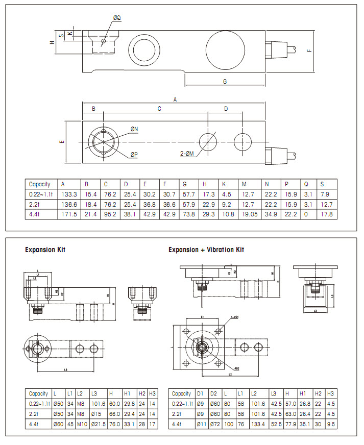 量程:220 kg, 550 kg, 1.1 t, 2.2 t, 4.4 t / 500, 1000, 2500, 5000, 10.000 lb