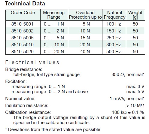 8510-5020:0-20N Model 8511: 8511-5005:0-±5N ;8511-5010:0-±10N ;