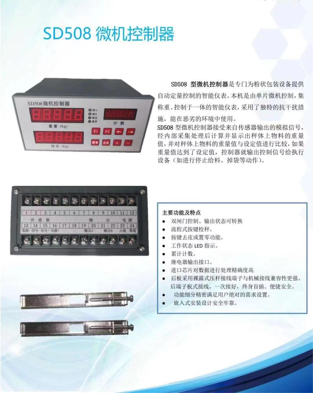 TRf廣州南創(chuàng)電子科技有限公司SD508型微機(jī)控制器接受來自傳感器輸出的模擬信號,經(jīng)內(nèi)部采集處理后計(jì)算并顯示出秤體上物料的重量值,并對秤體上物料的重量值與設(shè)定值進(jìn)行比較,如果重量值達(dá)到了設(shè)定值,控制器就輸出控制信號給執(zhí)行設(shè)備(如進(jìn)行停止給料、掉袋等動(dòng)作)。