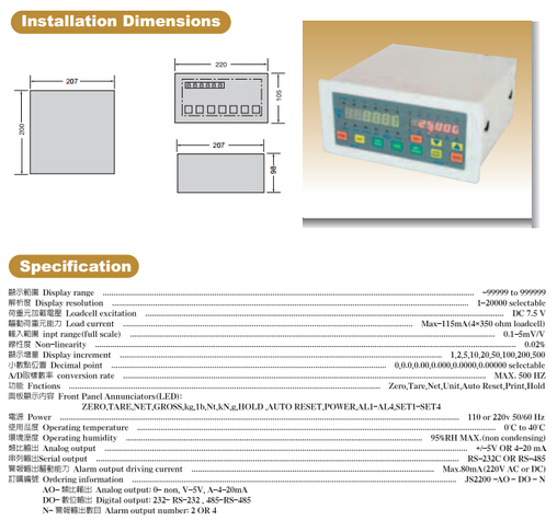 臺灣JIHSENSE JS-2200稱重顯示控制器規(guī)格圖: