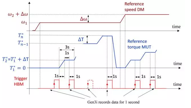 如圖所示,一個(gè)操作點(diǎn)持續(xù)了3秒。電機(jī)控制器產(chǎn)生了一個(gè) TTL 信號(hào)給 HBM 數(shù)據(jù)記錄儀,當(dāng)上升沿觸發(fā)被檢測到,數(shù)據(jù)記錄儀存儲(chǔ)了一秒的數(shù)據(jù)。按照所選操作點(diǎn)的數(shù)量,完整的過程持續(xù)了10到20分鐘。