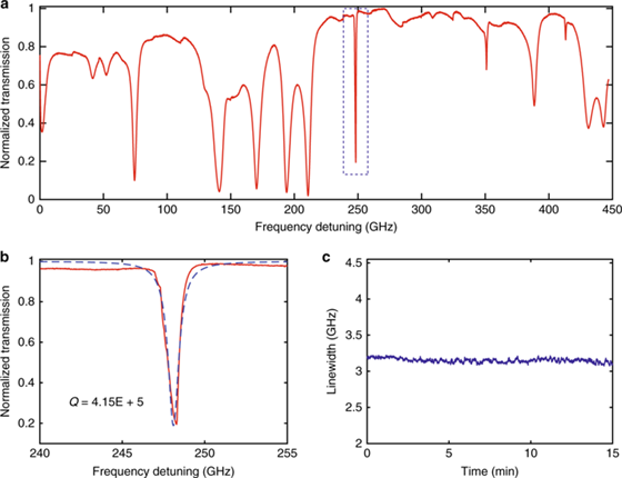 a頻率跨度為450 GHz的封裝WGM傳感器的傳輸頻譜,可以在傳感應(yīng)用中獲得具有不同線寬和極化的多個(gè)諧振模式。