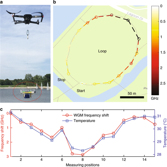 當(dāng)無人機(jī)從一個(gè)測(cè)量位置飛到另一個(gè)測(cè)量位置時(shí),WGM傳感器的共振頻率由于溫度變化而發(fā)生變化,共振頻率的變化如圖4b所示 ,其中可以清楚地看到溫度變化的梯度,測(cè)量結(jié)果與商用溫度計(jì)的結(jié)果匹配良好(圖 4c)。在補(bǔ)充材料中我們提供了視頻演示,其中攜帶整個(gè)系統(tǒng)的無人機(jī)從具有較高溫度(在陽光下)的一個(gè)位置飛行到具有較低溫度(在陰影中)的另一個(gè)位置,使用定制的移動(dòng)應(yīng)用程序可以清楚地觀察到共振頻率的偏移。