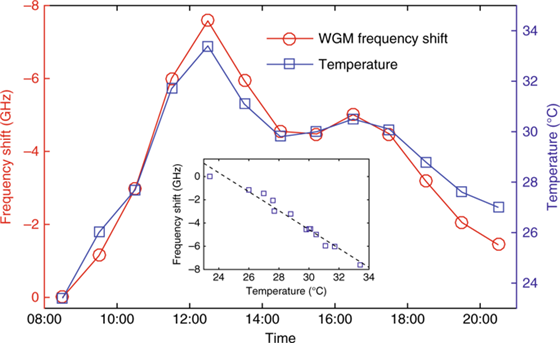 通過12小時(shí)的測(cè)量,我們獲得了所選諧振模式的頻移圖(如圖3所示) ,封裝WGM傳感器的共振頻率偏移與商用溫度計(jì)的結(jié)果匹配良好,并且與溫度變化具有線性關(guān)系(圖 3插圖)。兩條曲線的小偏差主要來自激光頻率的不穩(wěn)定性,通過優(yōu)化激光電流驅(qū)動(dòng)器和TEC控制器的電路設(shè)計(jì)可以將偏差最小化。