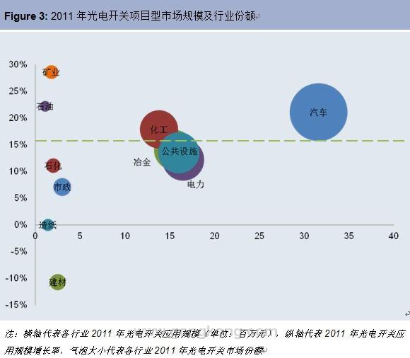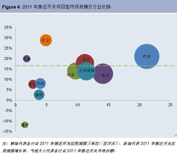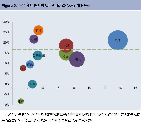 2011年,項目市場行程開關(guān)銷售額為7000萬元,同比增長16.7%,高于通用傳感器整體16.1%的增速。汽車、電力和冶金三大行業(yè)的銷售額分別為1370萬元、840萬元和700萬元,分別占比19.6%、12.0%和10.0%。