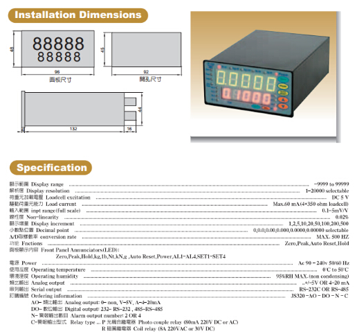 臺(tái)灣JIHSENSE JS-300稱重顯示控制器規(guī)格圖: