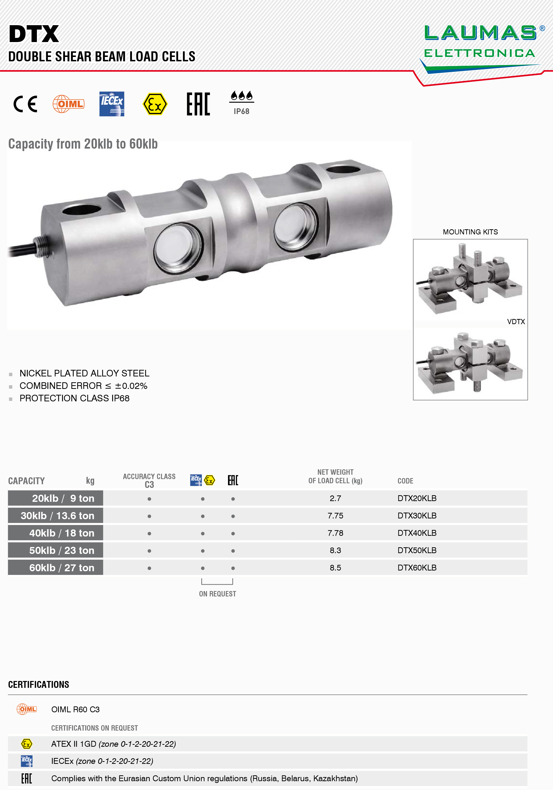 產(chǎn)品名稱:DTX雙剪梁稱重傳感器_DTX-20Kg,DTX-50Kg意大利Laumas