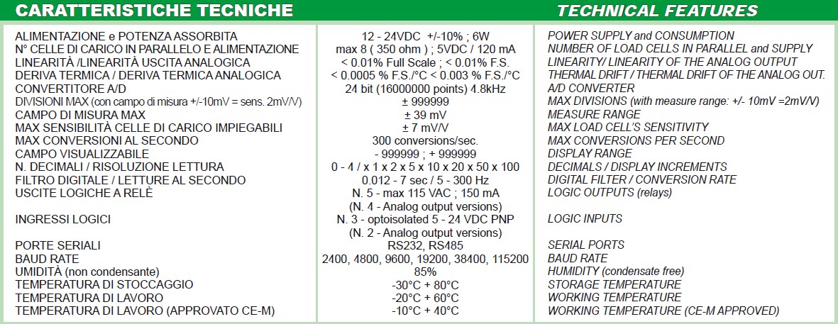 AISI 304 stainless steel Weight Indicator, dimensions 206 x 286 x 108 mm, stainless steel adjustable bracket included (overall dimensions: 206 x 290 x 187 mm). IP68 protection rating (IPX9K optional). Six-key membrane keyboard. 46 indicator symbols. Real time clock/calendar. Different versions for various types of electrical connections: cable glands, D-SUB connectors, removable terminal board/connectors.