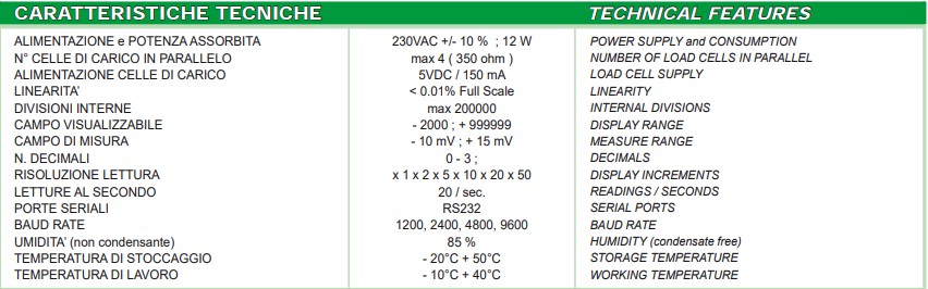ABS weight indicator suitable for desk or column mounting. Dimensions: 245 x 170 x 170 mm (245 x 170 x 220 mm overall dimensions with bracket). Six-digit semialphanumeric LED display (20 mm high), 7 segment. Five-key impermeable keyboard. Rechargeable internal battery 6V 4Ah with 230VAC power supply cable.