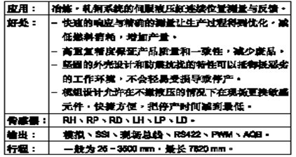傳感器的外殼類型、磁鐵類別、接頭方式、電纜長度、安裝方式等均由用戶或設計院決定,而輸出模式則應根據用戶選用的控制器而定,這些選項不是MTS公司能決定的,但可以提供協助。 應用范圍: MTS產品應用十分廣泛,特別概括了一些成功應用領域 測量范圍-動作感應,直線性位移,弧度線性位移,速度 測量目的-位置測量,回授控制(閉環(huán)系統(tǒng)) 測量數據-絕對位置,速度,相對位置 應用環(huán)境-所有需要高速,精確,長,短行程的作動系統(tǒng),如液壓動力,伺服位置與速度控制 目標市場-工業(yè):工廠自動化生產線,如鋼鐵廠,注塑與壓鑄,木材加工,水電廠和紙品加工 商業(yè):汽車,行走機械,飛機,消費電子,醫(yī)療設備,家用電氣等 專業(yè):特殊案子,如斜坡護土監(jiān)控及打撈俄羅斯庫爾斯克號潛艇 |